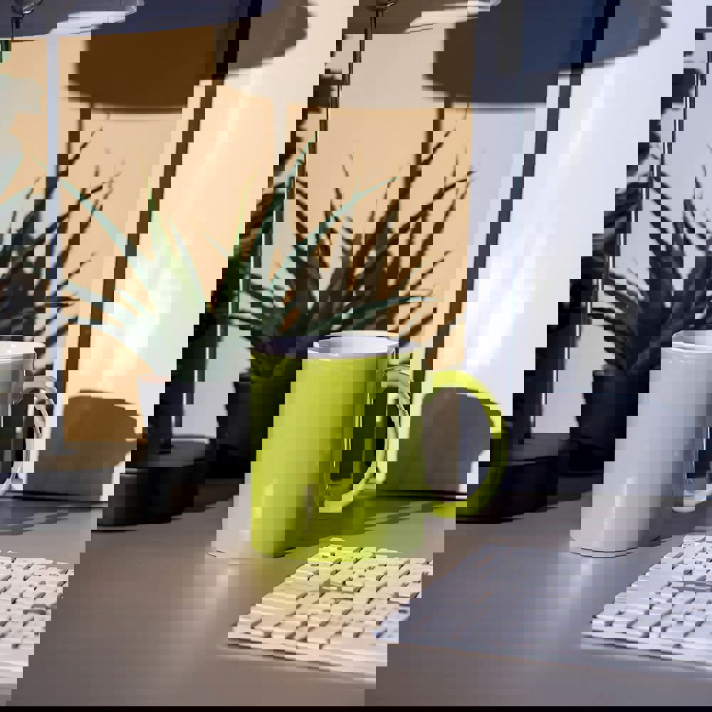 Material: Steingut (Keramik). Füllvolumen: ca. 300 ml. Farben: Schwarz, Gelb, Orange, Dunkelblau, Hellgrün. Großes Druckfeld für einseitigen, beidseitigen oder umlaufenden Druck (abhängig vom Verfahren). Variantenartikel mit mehreren Farbausführungen. Pflegehinweis: Zur Schonung des Drucks empfehlen wir Handwäsche.