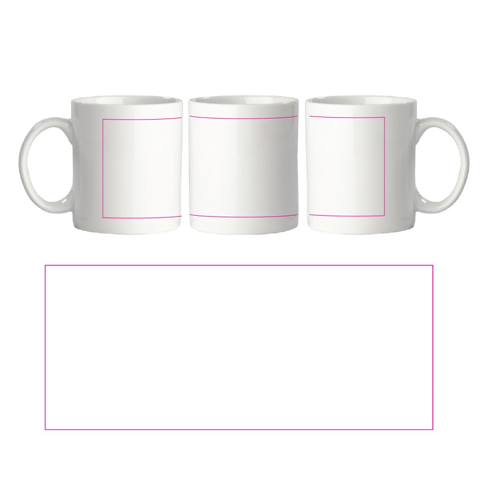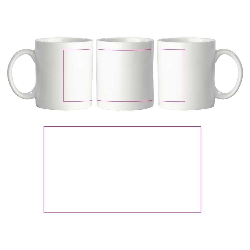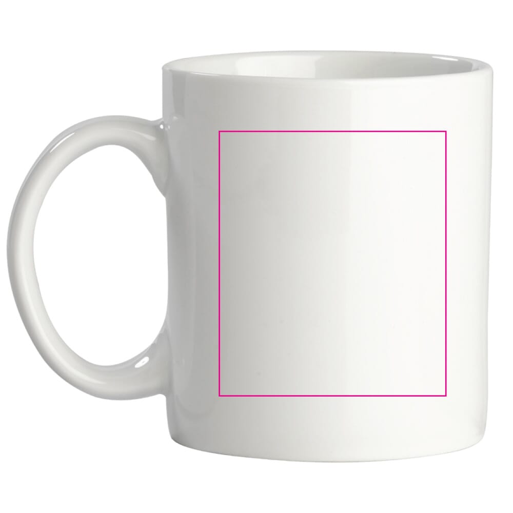 Material: Porzellan. Farbe: Weiß. Füllvolumen: ca. 300 ml. Oberfläche mit großem Druckbereich für Logos und Motive. Geeignet für Heiß- und Kaltgetränke. Varianten verfügbar (ohne Druck oder mit Druck).