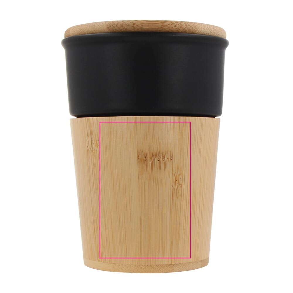 Füllmenge: ca. 300 ml. Material: Keramikbecher mit Bambus-Außenseite und Bambusdeckel. Farben: Schwarz, Weiß. Produkttyp: variabel (Farbvarianten wählbar). Personalisierung: Logodruck möglich. Pflegehinweis: Handwäsche empfohlen, um Bambus und Druck zu schonen. Hinweis: Bambus ist ein Naturmaterial; Maserung und Farbton können variieren.