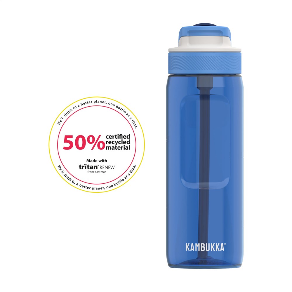 The Kambukka Lagoon 750 ml drinking bottle is a reusable water bottle with a Spout lid, drinking spout, and curved straw. You can drink without tilting your head, which is practical while driving and during sports. The spout is protected from dirt when closed. The bottle is made from clear, odourless Tritan Renew with 50% certified recycled content and is BPA-free. It is 100% leak-proof. The universal lid also fits other Kambukka bottles. The bottle and lid are dishwasher-safe; for printed items, handwashing is recommended to preserve the print. This bottle can be printed with your own logo.