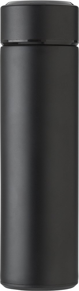 Capacity: 450 ml. Material: stainless steel bottle with stainless steel tea strainer. Cap with LED temperature display, activated by tapping the top. Integrated, non-replaceable battery for the LED. Screw cap. Reusable design. Colors: Black, Silver. Variable product with options for color and decoration.