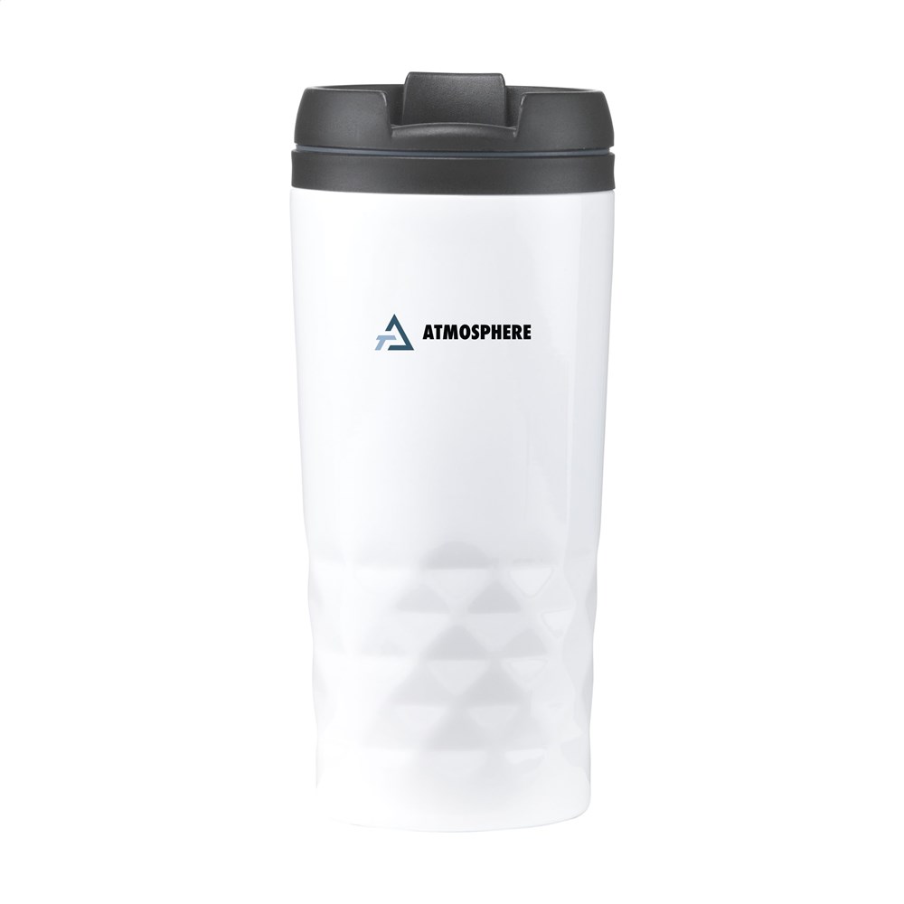 Double-walled thermal mug. Stainless-steel outer wall and PP inner wall. Secure screw lid with click opening. 3D geometric diamond-patterned holder for grip. Non-slip base. Capacity 300 ml. Not dishwasher safe; hand wash recommended. Individually boxed. Colours: black, red, white, blue, and silver.