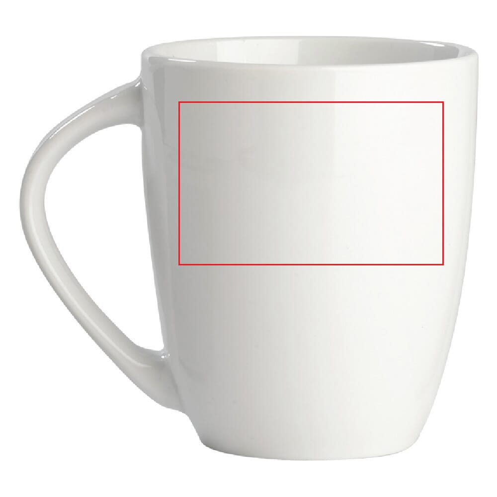 Capacity: 270 ml. Material: porcelain. Colour: white. Shape: conical. Handle: large ear for easy holding. Origin: produced in Europe. Branding: printable with your logo. Product type: variable (multiple print options and configurations available).