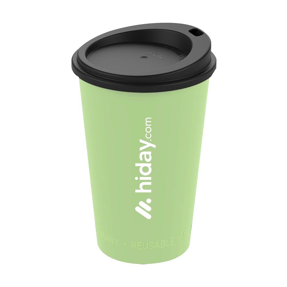 The Coffee Mug Hazel 300 ml is a reusable plastic coffee-to-go mug with a secure lid and drinking opening. You can print this coffee mug with your own logo. It is a practical alternative to single-use cups. The mug is fully recyclable, stackable, and fits in most standard car cup holders. Dishwasher safe; hand washing is recommended to protect the print. Capacity 300 ml. Made in Germany. Available colours: black, green, blue, and brown.