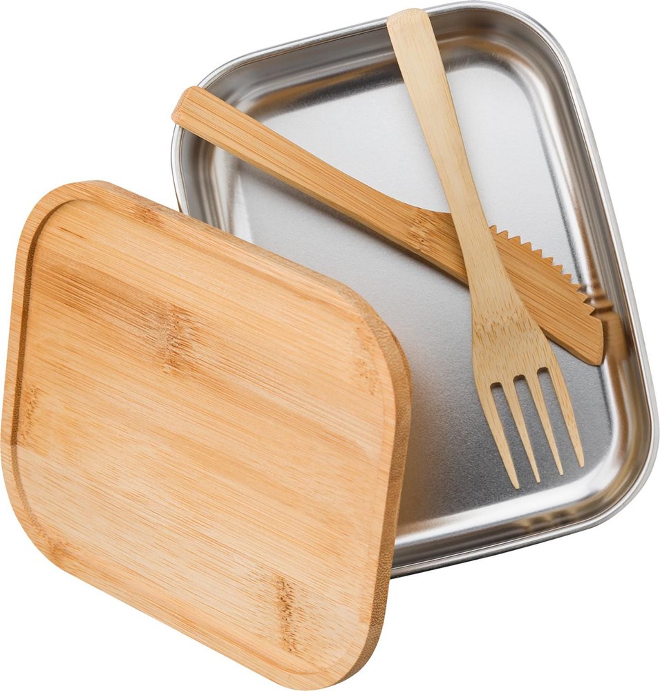 RVS lunchbox bedrukken met bestek en bamboe deksel