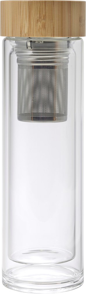 Inhoud: 420 ml. Materiaal: bamboe en glas. Constructie: dubbelwandig. Accessoire: metalen thee-infuser inbegrepen. Kleur: bruin. Verpakking: per stuk in een bruine kartonnen doos. Categorie: BIO. Het product is herbruikbaar en geschikt voor warme en koude dranken. Handwas wordt aangeraden om materiaal en opdruk te behouden.