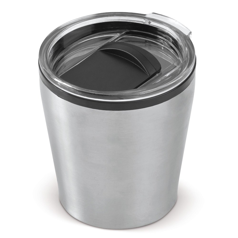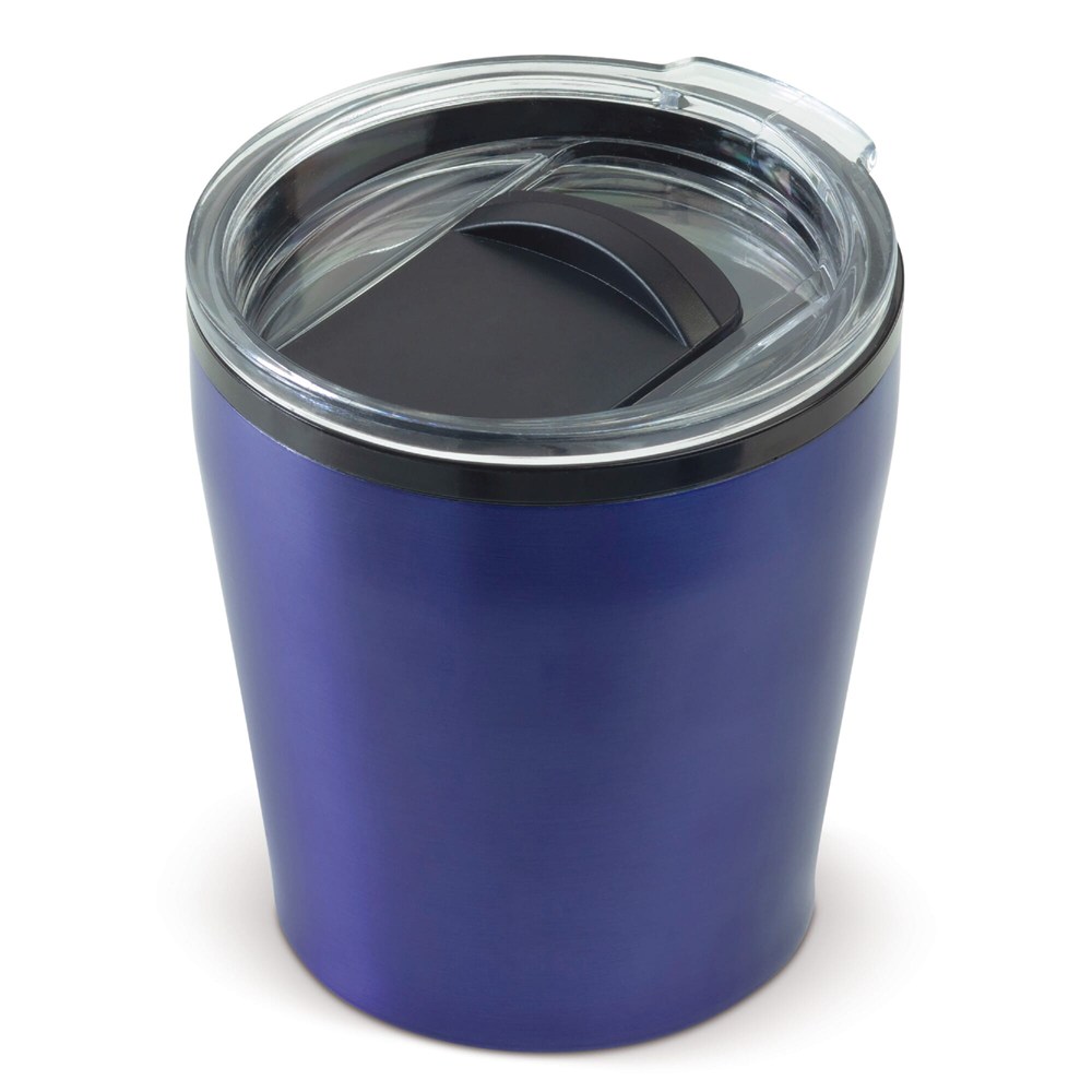Inhoud 180 ml. Dubbelwandige koffiebeker met metallic afwerking. Compact formaat dat onder veel koffiemachines past. Verkrijgbaar als variabel product in meerdere kleuren: Zwart, Oranje, Donkerblauw, Zilver, Lichtblauw, Donker-rood. Geschikt voor hergebruik. Bedrukbaar met eigen logo. Minimale afname: van toepassing.