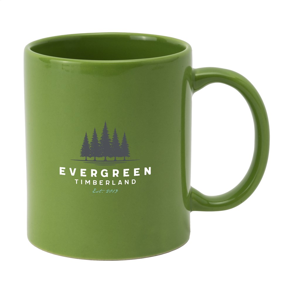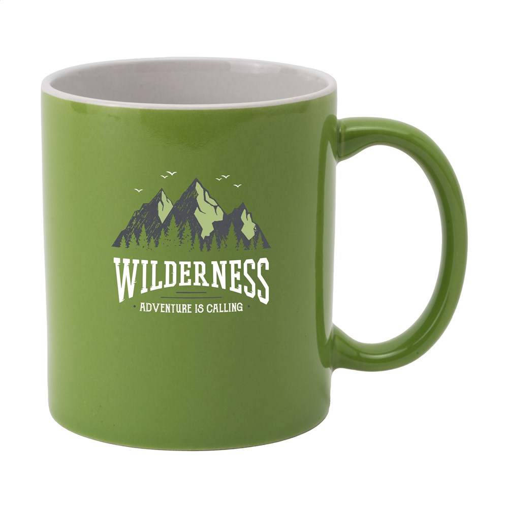 Materiaal: keramiek. Inhoud: 350 ml. Kleurkeuze: Zwart, Geel, Oranje, Rood, Paars, Blauw, Grijs, Lichtgroen, Lichtblauw, Navy. Afwerking: gekleurde buitenzijde per variant. Vaatwasserbestendig. Opdruk getest en gecertificeerd volgens EN 12875-2. Geschikt voor warme en koude dranken. Producttype: variabele artikelen met meerdere kleurvarianten.