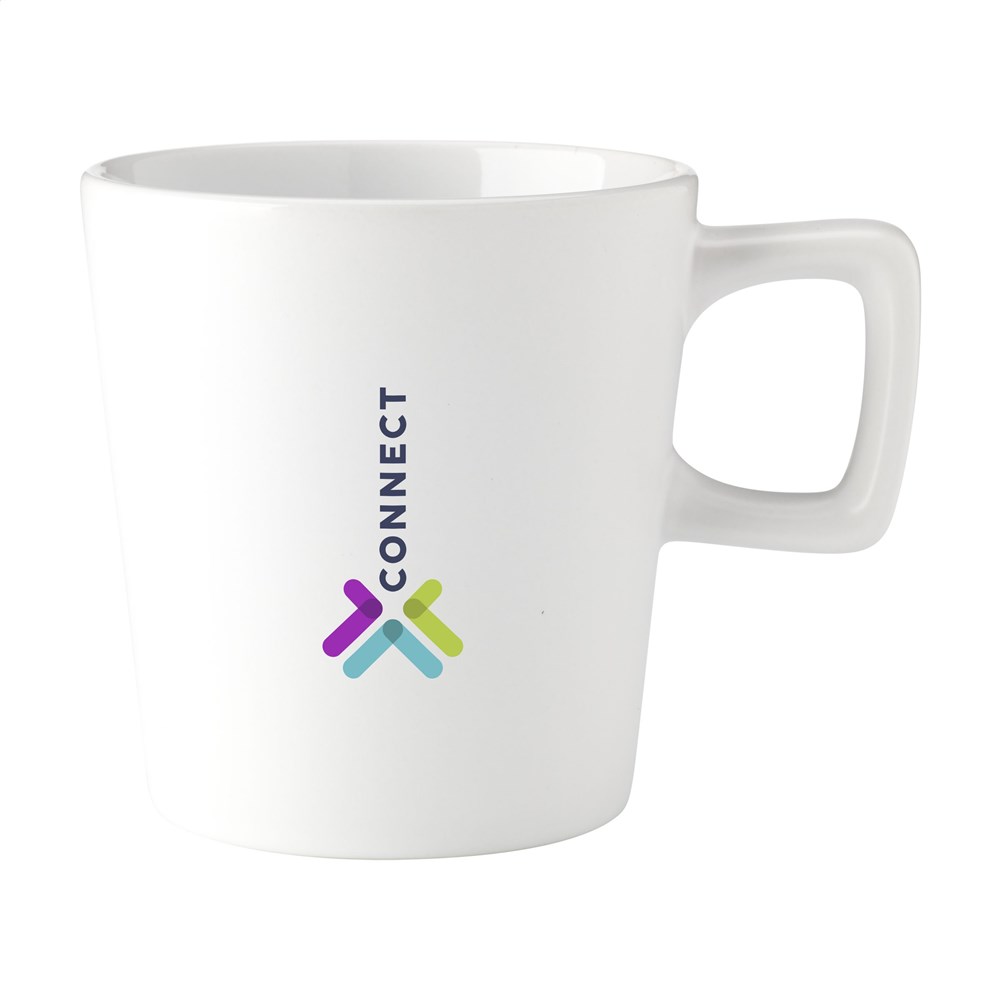 Materiaal: keramiek met 5% gerecycled keramiek. Vorm: rechte mok met hoekig oor. Afwerking: buitenkant mat, binnenkant hoogglans. Inhoud: 290 ml. Reiniging: vaatwasserbestendig. Kleurkeuze: zwart, wit, groen, grijs, navy. Personalisatie: bedrukking en lasergravure (niet op wit). Opmerking gerecycled keramiek: hergebruik van fijngemalen keramiekresten stimuleert de circulaire economie en vermindert de vraag naar nieuwe grondstoffen.