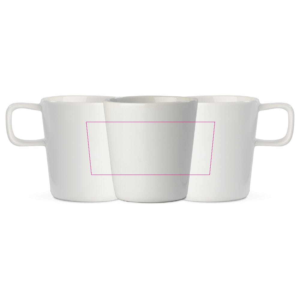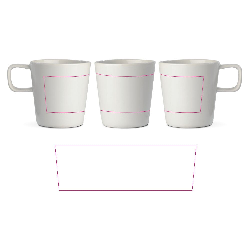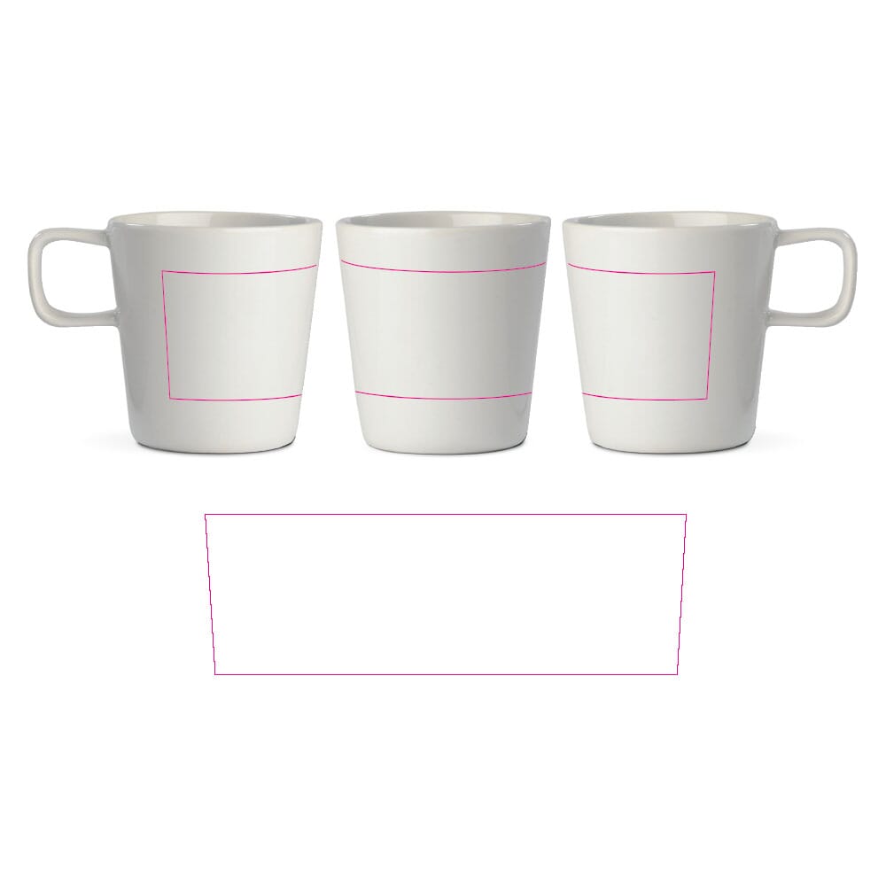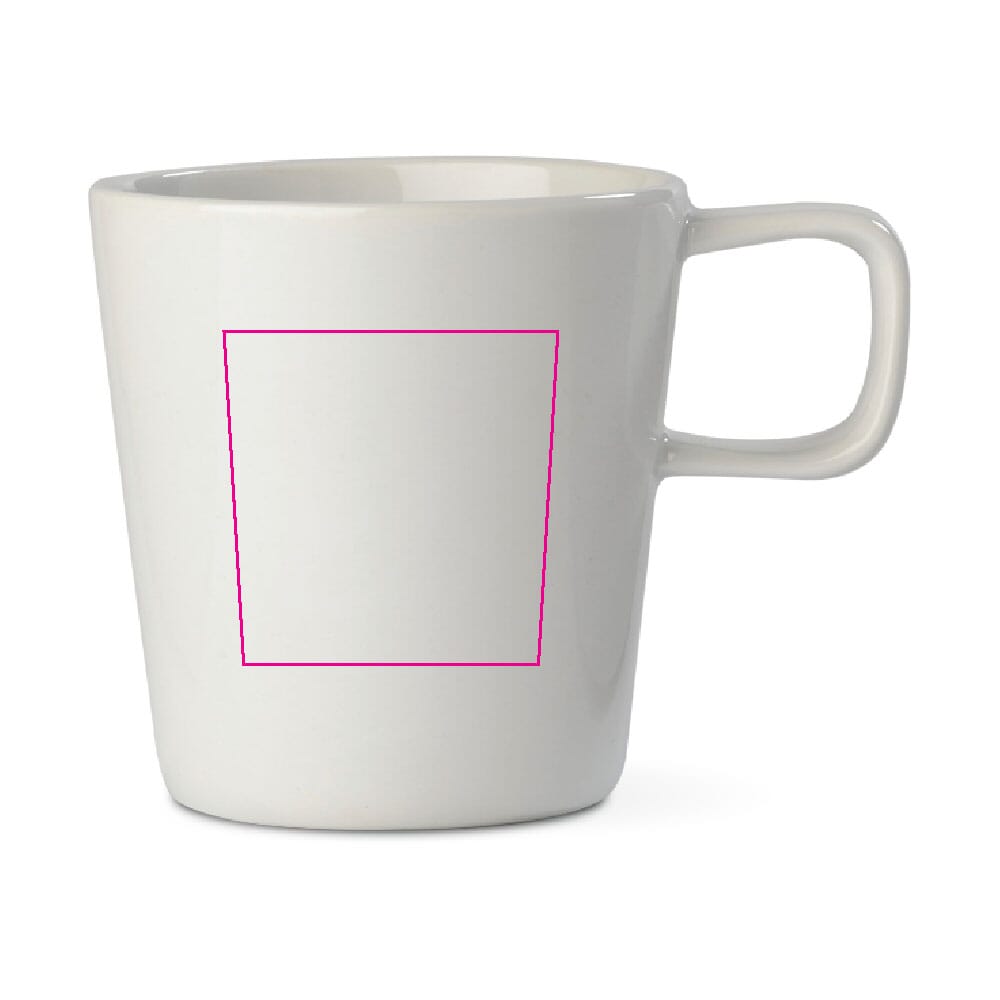 Je kunt de mok laten bedrukken met je eigen logo en huisstijl. Bedrukking kan op één zijde, beide zijden of rondom, afhankelijk van het ontwerp. Gebruikelijke technieken zijn keramische transfer (ook full colour) en zeefdruk in PMS-kleuren.